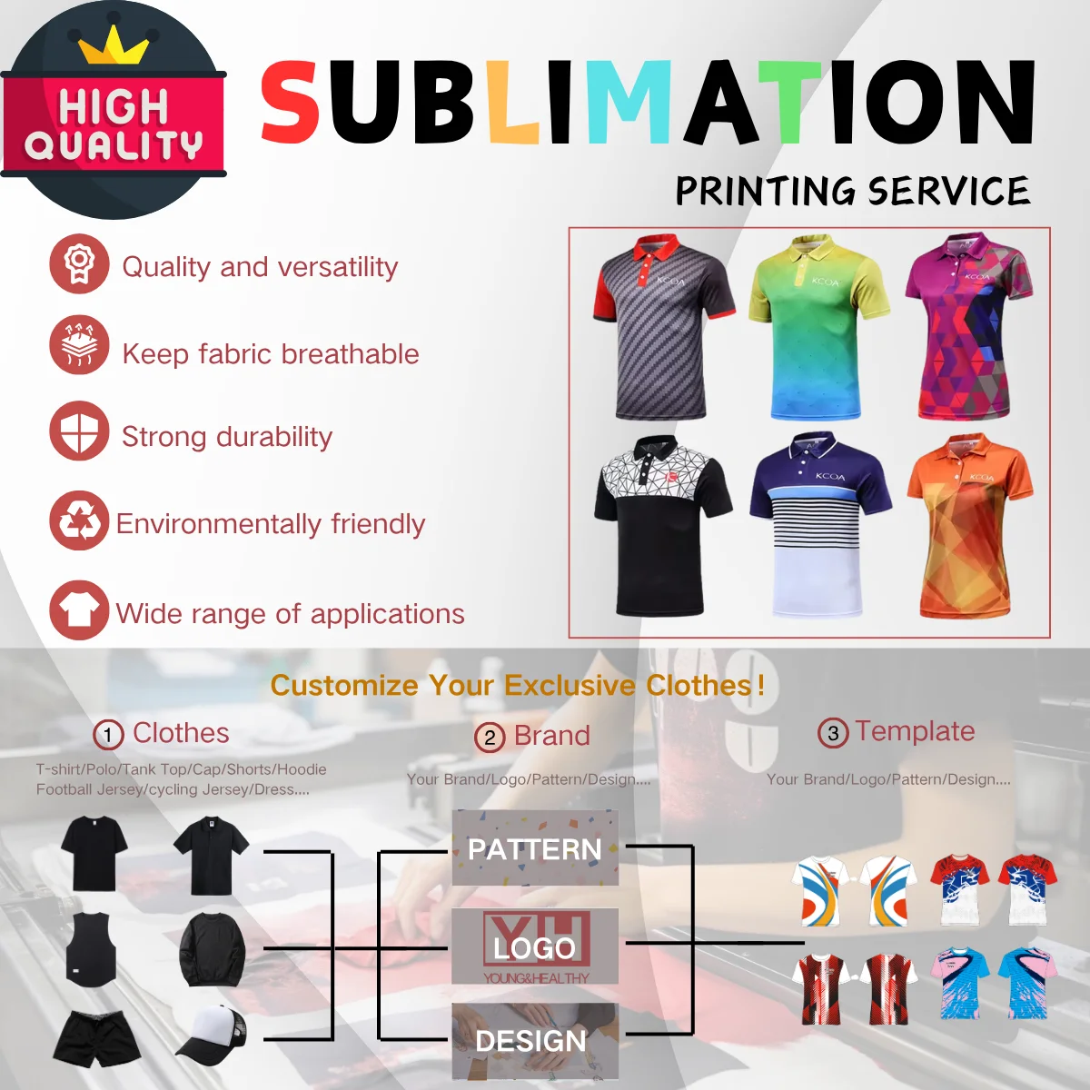 3. We offer OEM service with different technology, such as sublimation printing, embroidery, silk screen printing, heat transfer printing...